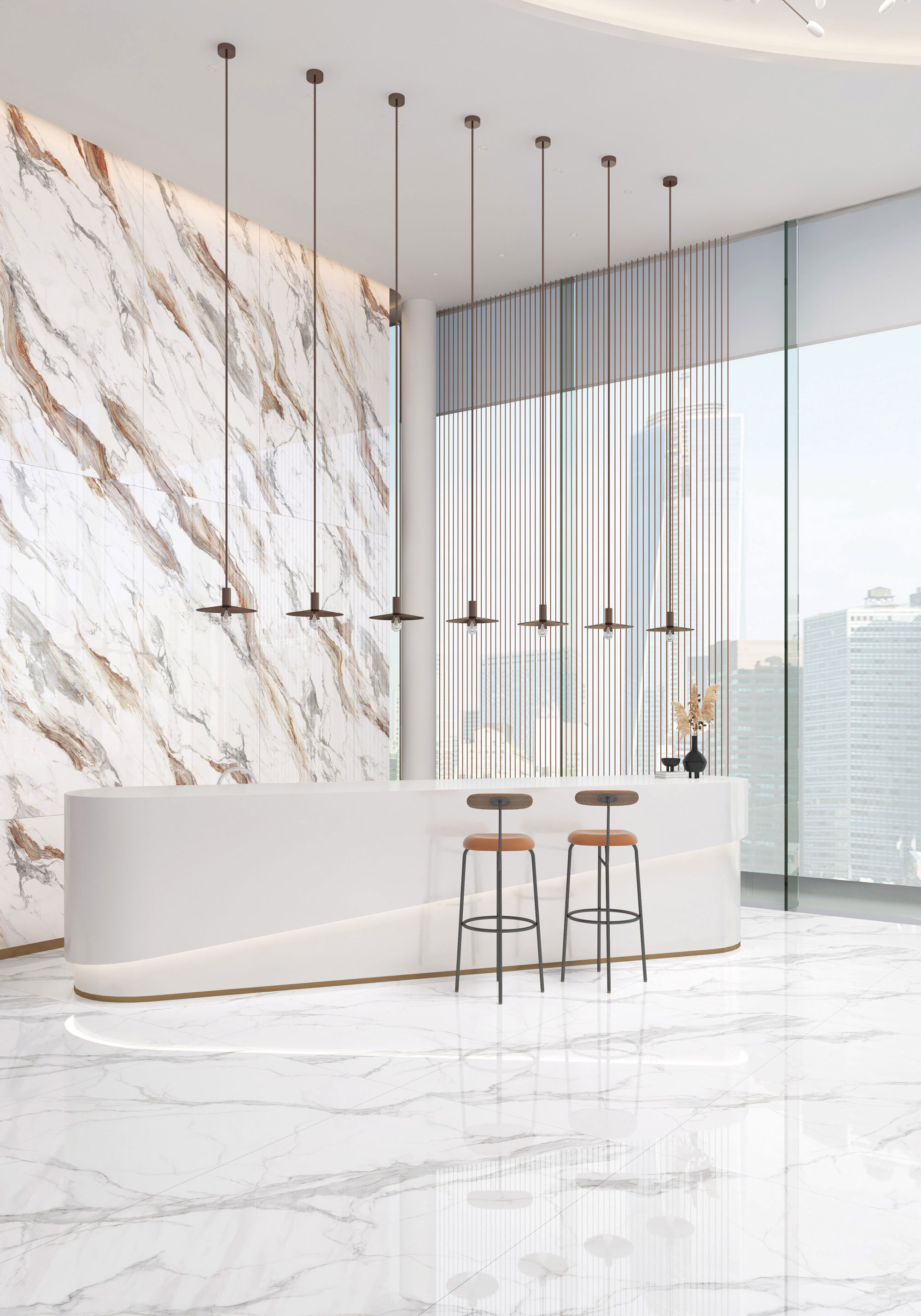 以山間云霧繚繞的祁連山脈為原型,承襲青灰色基調,鑲嵌著連綿起伏的肌理,如壯闊而嬌媚的千里雪景,明暗有度,生動而富于變化,在動靜與變化之間隨意流轉。無限連紋連貫延伸,打造空間的開闊視野,賦予空間雅致氣質。